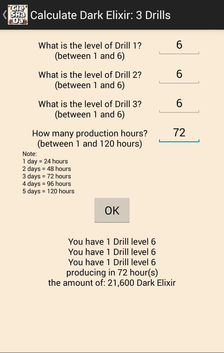 Calculez la production d'or, d'élixir et d'élixir sombre en fonction de l'heure: où vous pouvez calculer la production d'or, d'élixir et d'élixir sombre en fonction de l'heure choisie, par exemple: une mine d'or de niveau 9 produit en or en 24 heures? La réponse que vous pouvez trouver dans l'application.